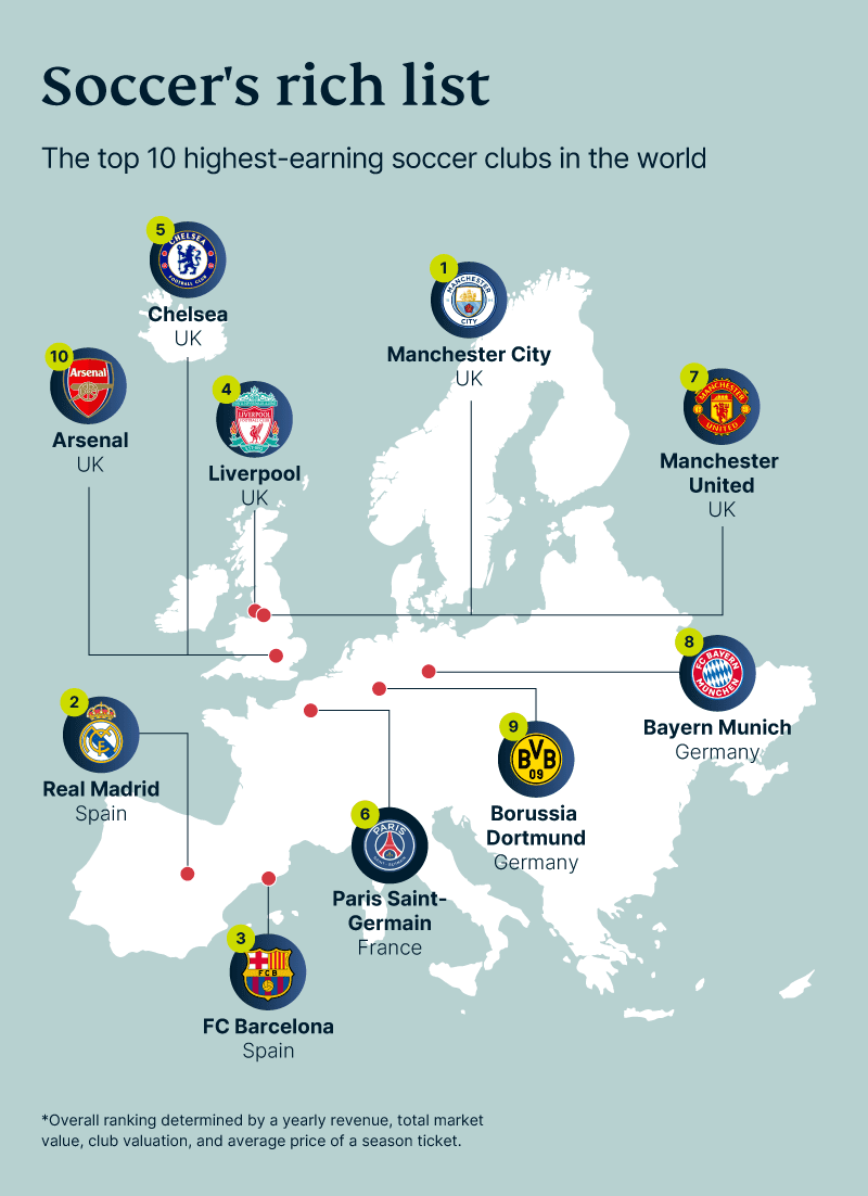 But despite this evolving landscape, Europe remains the epicenter of soccer wealth, thanks to deep-rooted investments and a rich history with the sport. We rank the top wealthiest soccer clubs not just on their on-field achievements but on their yearly revenue, total market value, club valuation, and the average price of season tickets: