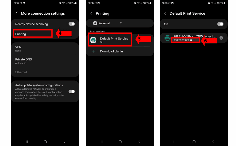 Steps 4-6: Tap on Printing and select Default Print Service. Your printer IP will appear directly under the name of your printer.