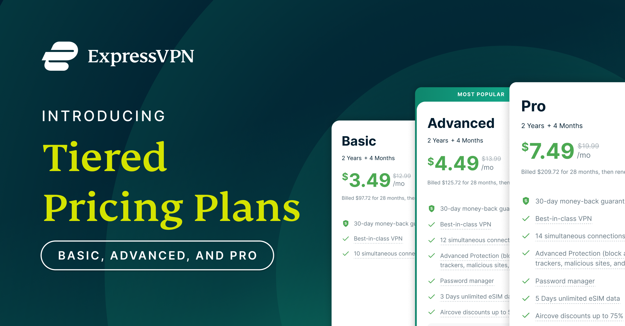 Today, we’re making the biggest pricing change in our history. We’re introducing three new plans: Basic, Advanced, and Pro. This marks a fundamental shift in how ExpressVPN is offered, built on the reality that the internet has changed along with your privacy needs.