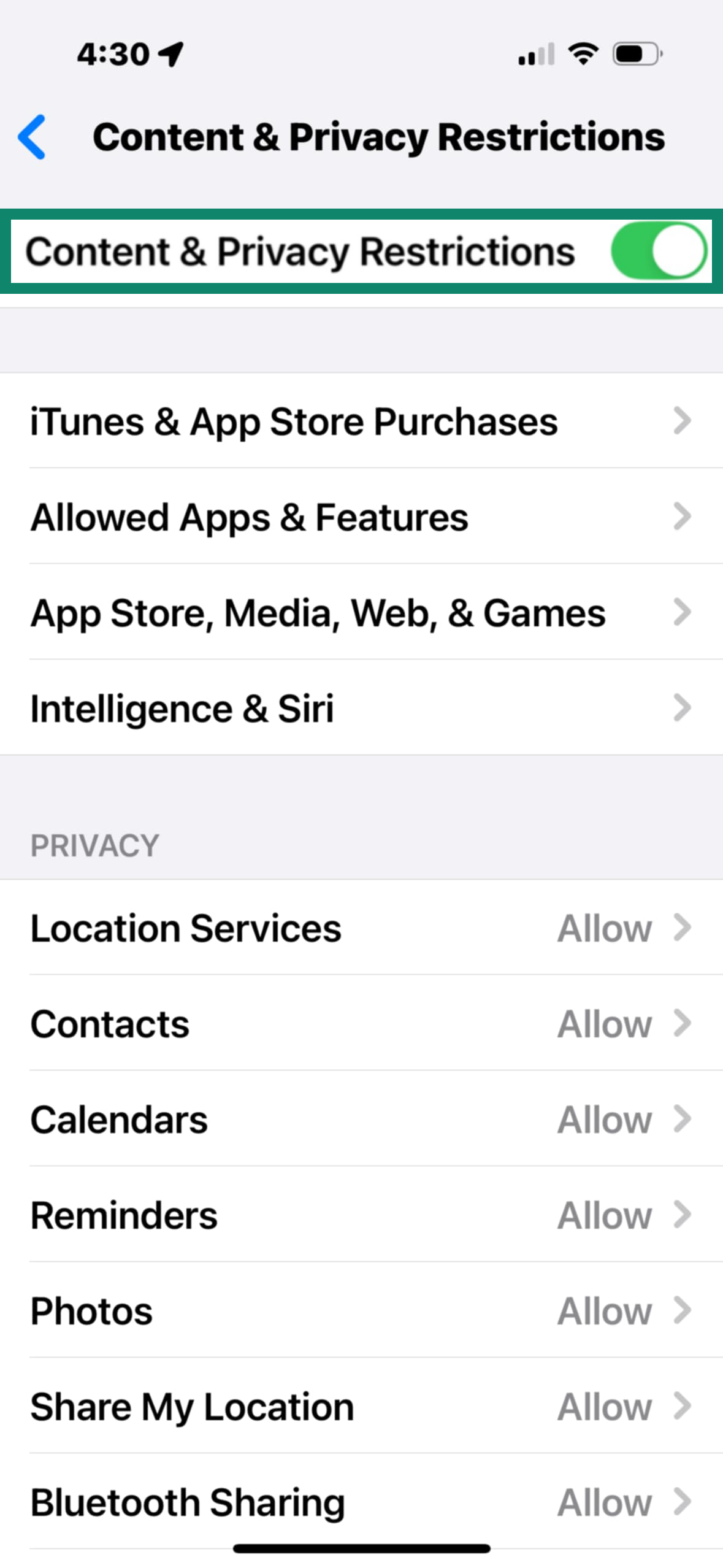 Screen Time settings with Content & Privacy Restrictions highlighted.