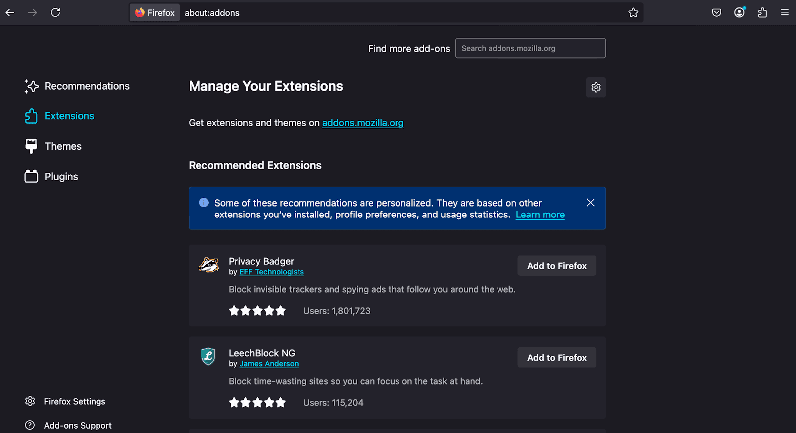 - Select Add-ons and Themes, then go to the Extensions tab.