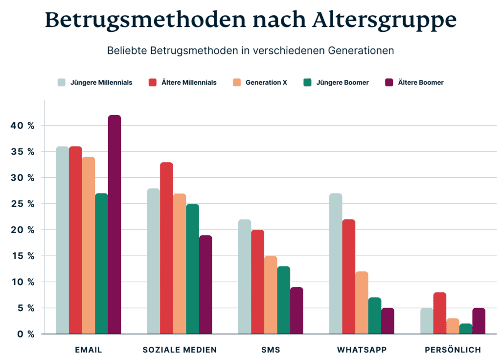 Soziale Medien stehen als Nährboden für Betrug nicht weit dahinter, besonders da ältere Erwachsene auf Plattformen wie Facebook aktiver werden. Laut unserer Umfrage sind 27 % der Opfer aus der Generation X, 25 % der Opfer aus der Generation der jüngeren Babyboomer und 19 % der Opfer aus der Generation der älteren Babyboomer Opfer von Betrug in sozialen Medien geworden.