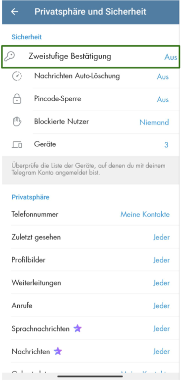 Nachdem Du die 2FA eingerichtet hast, überprüfe Deine allgemeinen Sicherheitseinstellungen im Menü „Datenschutz und Sicherheit". Hier kannst Du die Option „Nachrichten automatisch löschen” aktivieren und festlegen, wer Dich zu Gruppen hinzufügen, Deine Nachrichten weiterleiten oder Deine Online-Aktivitäten sehen darf.