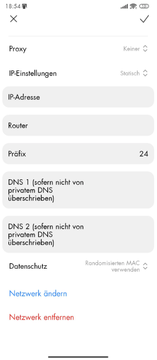4. Sie sollten nun ein Menü mit den Netzwerkeinstellungen sehen, die Sie frei ändern können, inklusive der DNS-Server. Bei einigen Geräten müssen Sie möglicherweise auch Ihre IP-Einstellungen auf „Statisch” ändern, bevor Sie die DNS-Einstellungen ändern können.