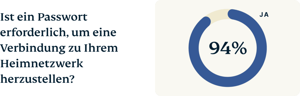 Unsere Umfrageergebnisse lassen erkennen, dass eine große Mehrheit (94 %) der Befragten ihr heimisches WLAN mit einem Passwort schützt, was mit der gängigen Praxis übereinstimmt, Passwörter bei der Installation des Routers einzurichten. Darüber hinaus geben 33 % der Befragten an, ihr Passwort regelmäßig zu aktualisieren. Dies ist zwar nicht notwendig, wenn Sie ein sicheres Passwort in einem Passwort-Manager gespeichert haben, kann aber verhindern, dass frühere Nutzer Ihres WLANs auch weiterhin auf dieses zugreifen können.