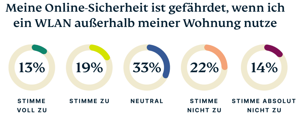 Fast die Hälfte der Befragten (47 %) glaubt, dass ihre Sicherheit gefährdet ist, wenn sie sich mit einem fremden WLAN verbinden. Dies zeigt ein Bewusstsein für die Risiken, die mit der Nutzung von öffentlichem WLAN verbunden sind – auch wenn die Nutzung eines unbekannten Netzwerks nicht automatisch bedeutet, dass Ihre digitale Privatsphäre beeinträchtigt ist.