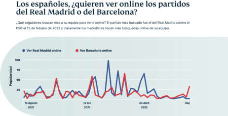 Una pregunta inevitable en el panorama futbolístico español es: ¿se busca más el Real Madrid o el Barcelona? La rivalidad entre ambos equipos va más allá de las fronteras españolas. En el resto del mundo, ¿qué equipo es el más popular? La temporada pasada, el Real Madrid jugó 56 partidos y el Barcelona 53 partidos de acuerdo con FBREF; aún así, concluimos que el término más popular es “ver Real Madrid online”. Cuando ambos equipos se enfrentan en un “Clásico” las búsquedas crecen a la par, con resultados idénticos.