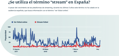 El primer dato interesante es que a la hora de buscar opciones para ver el deporte rey, la mayoría de personas utilizan el término “ver fútbol online” en lugar de “stream”. Esto se debe a que, si bien las cadenas como Gol han aumentado su audiencia, no existen plataformas de streaming como tal sino cadenas de televisión que pueden verse a través de internet. Además, el concepto de “streaming” aún se asocia a ver otros contenidos de entretenimiento como series o películas, no necesariamente deportes.