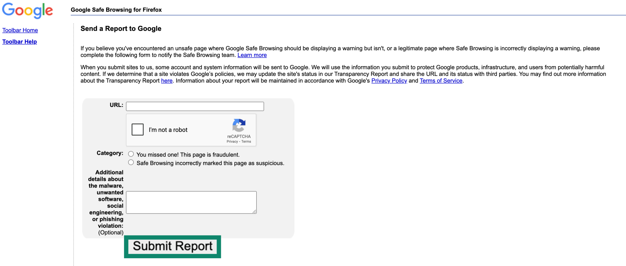 - Ve a Google Safe Browsing Report y pega la URL sospechosa (no el archivo en sí, solo el enlace a él.