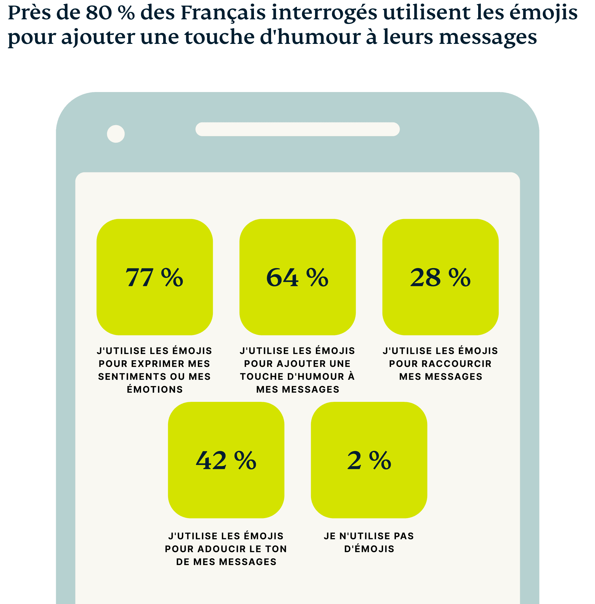 Plus de la moitié (78 %) des Français interrogés affirment ne pas croire que les émojis adoucissent l'annonce d'une mauvaise nouvelle, une opinion bien plus répandue qu’au État-Unis, en Allemagne ou en Espagne. Cependant, plus de la moitié des personnes interrogées déclarent avoir utilisé des émojis pour ne pas révéler leurs sentiments.