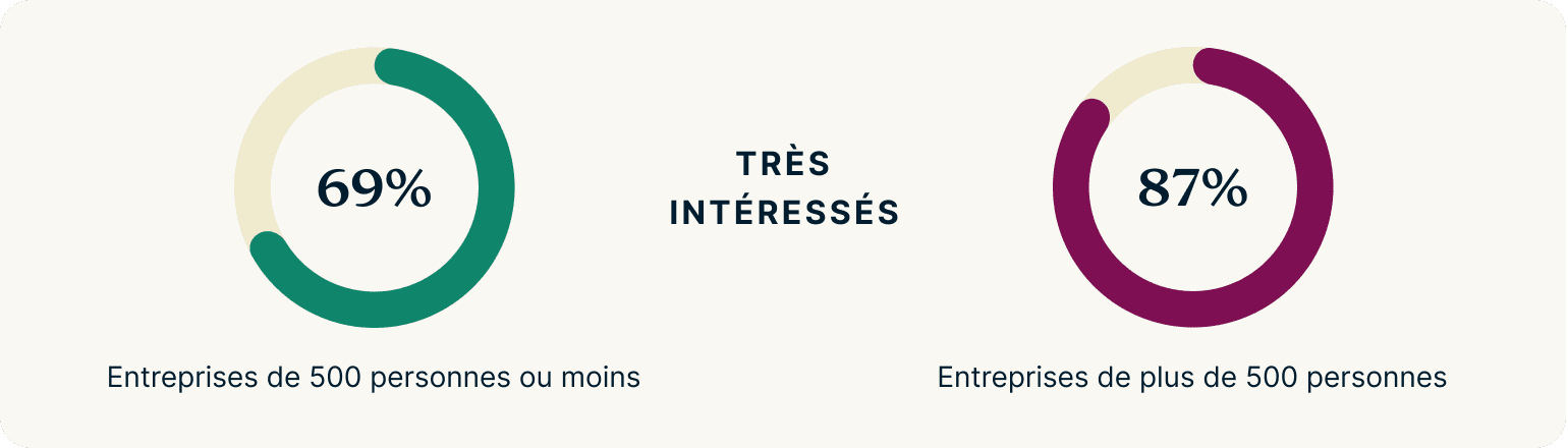 Les employeurs des entreprises de plus de 500 collaborateurs sont les plus intéressés par un environnement de travail immersif, par rapport aux entreprises de moins de 500 collaborateurs. Les salariés des grandes entreprises, en revanche, sont les moins susceptibles de dire qu'ils seraient intéressés par un travail dans le métavers.
