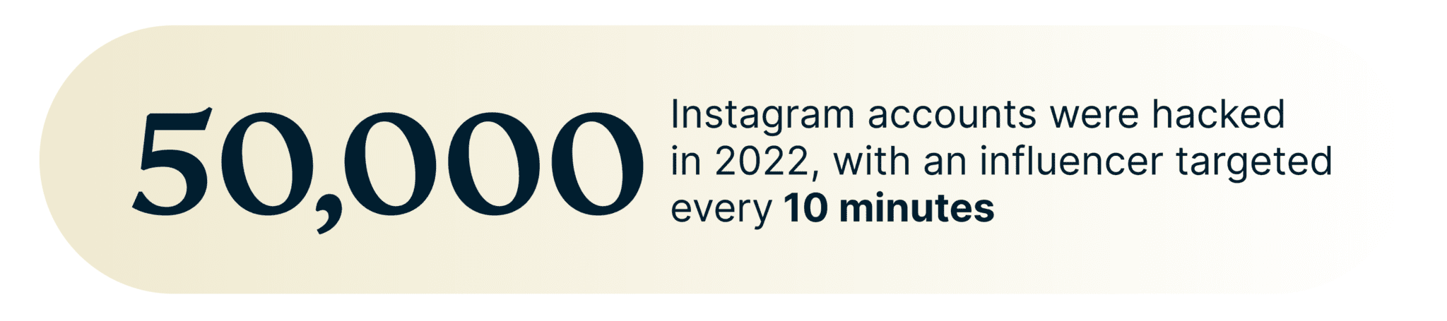 Una delle minacce più comuni che gli influencer affrontano è l'hacking e l'acquisizione degli account. I criminali informatici spesso usano scam di phishing per indurre gli influencer a consegnare le loro credenziali di accesso. Nel 2022, 50.000 utenti di Instagram sono stati hackerati—con un influencer preso di mira ogni 10 minuti.