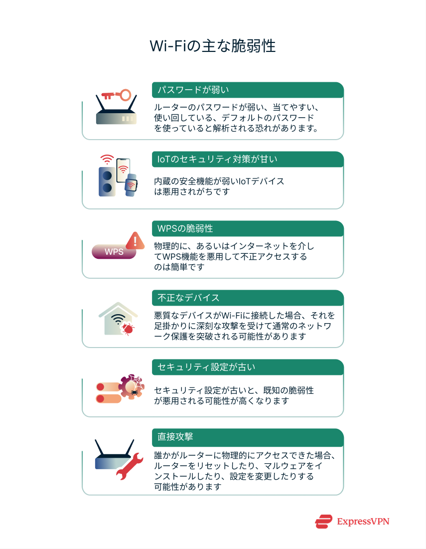• WPSの脆弱性:Wi-Fi Protected Setup(WPS)を活用するとすばやくログインできるのが便利ですが、サイバー犯罪者がネットワークに不正アクセスするために悪用されやすいという欠点があります。犯罪者はルーターのボタンを押すだけで接続できます。また、8桁のコードがあればインターネット経由でWPSにアクセスできますが、部外者はこのコードを容易に推測できてしまいます。