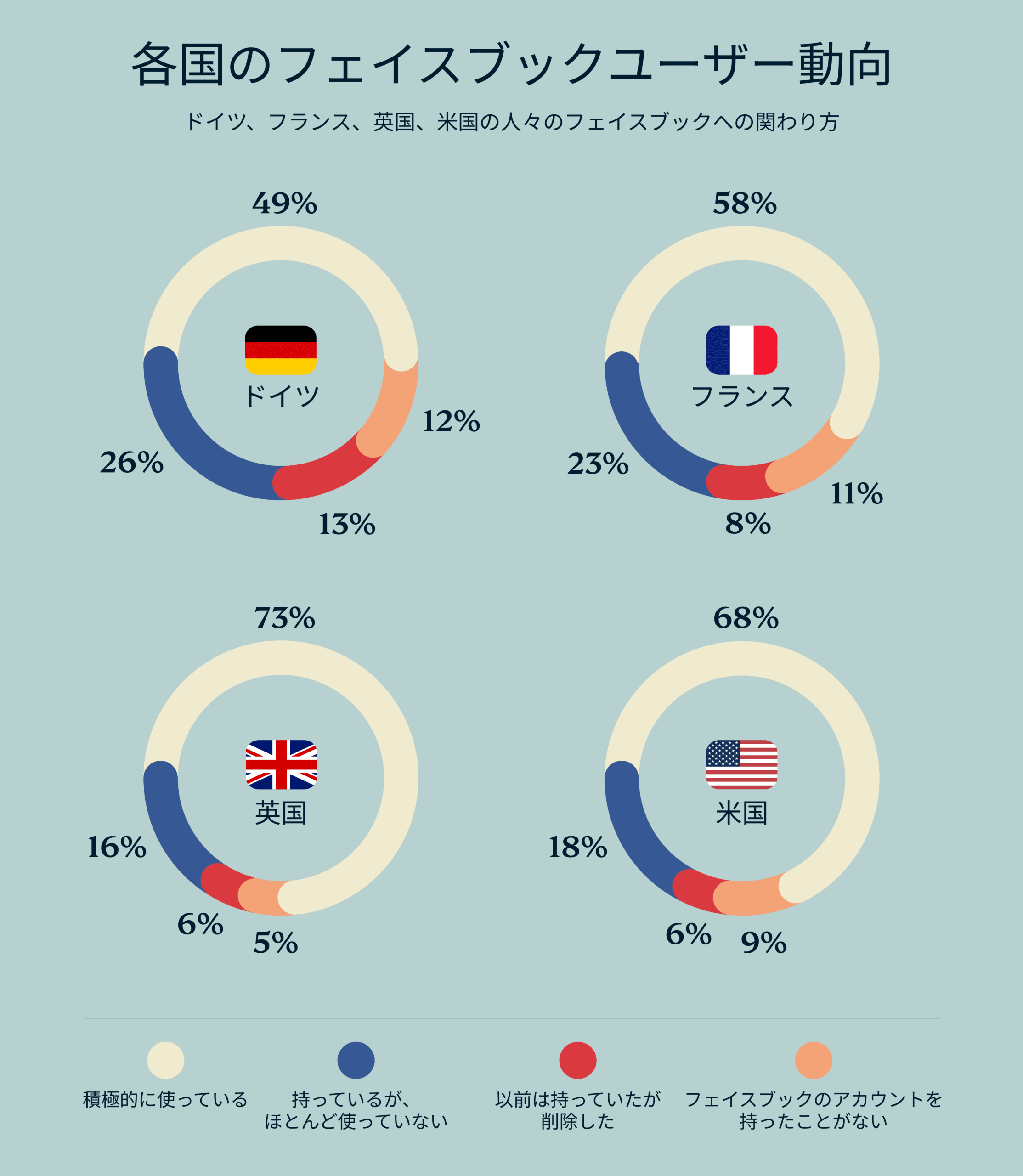 Facebookは今も世界的な巨大プラットフォームですが、その内情を詳しく見ると、興味深い違いが浮かび上がります。英国では73%の回答者が「アクティブに利用している」と答えており、米国もそれに続き、68%が定期的にログインしています。一方、フランスとドイツでは利用率がやや低く、それぞれ58%、49%にとどまっています。さらに、これらの国では利用頻度が減少している人も多く、ドイツでは26%、フランスでは23%が「ほとんど利用しなくなった」と答えています。