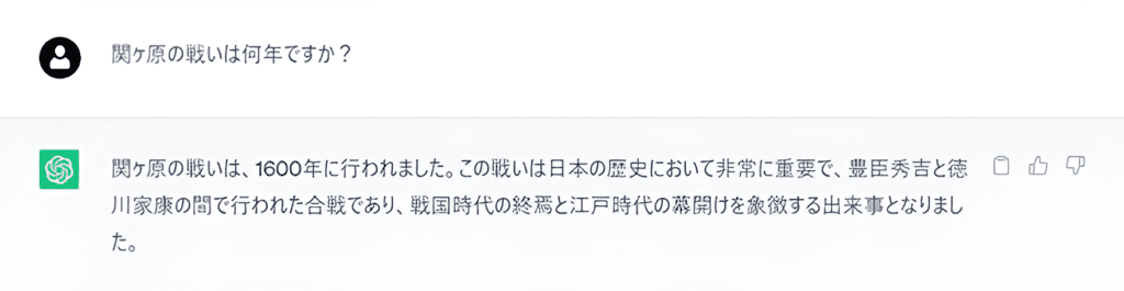 また、ChatGPTは「豊臣秀吉と徳川家康の間で行われた合戦」と述べていますが、豊臣秀吉は1598年に死亡しているため、1600年の関ヶ原の戦いの時にはいないはずです。豊臣秀吉の死後に続いた政治的な対立であることが述べられておらず、満点の回答には至りませんでした。