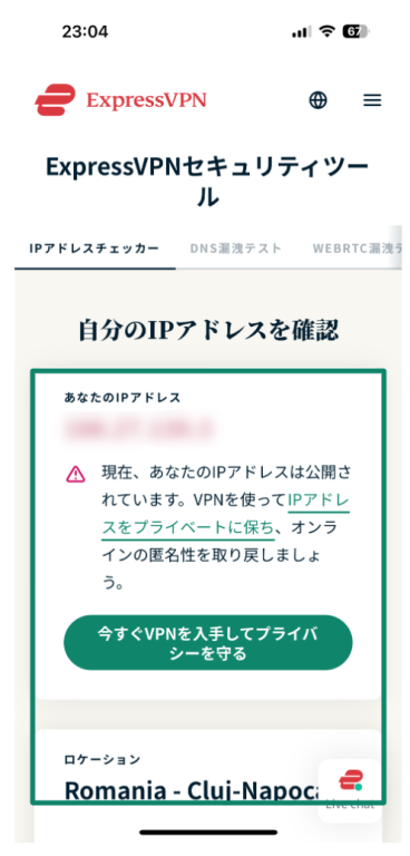 iPhoneのパブリックIPアドレスを調べるには、Safariなどブラウザを開いてExpressVPNのIPチェッカーなどのIPアドレス確認サイトにアクセスしましょう。すぐにパブリックIPアドレスと位置情報が表示されますので、Webサイト側にどのような情報が公開されるか分かります。
