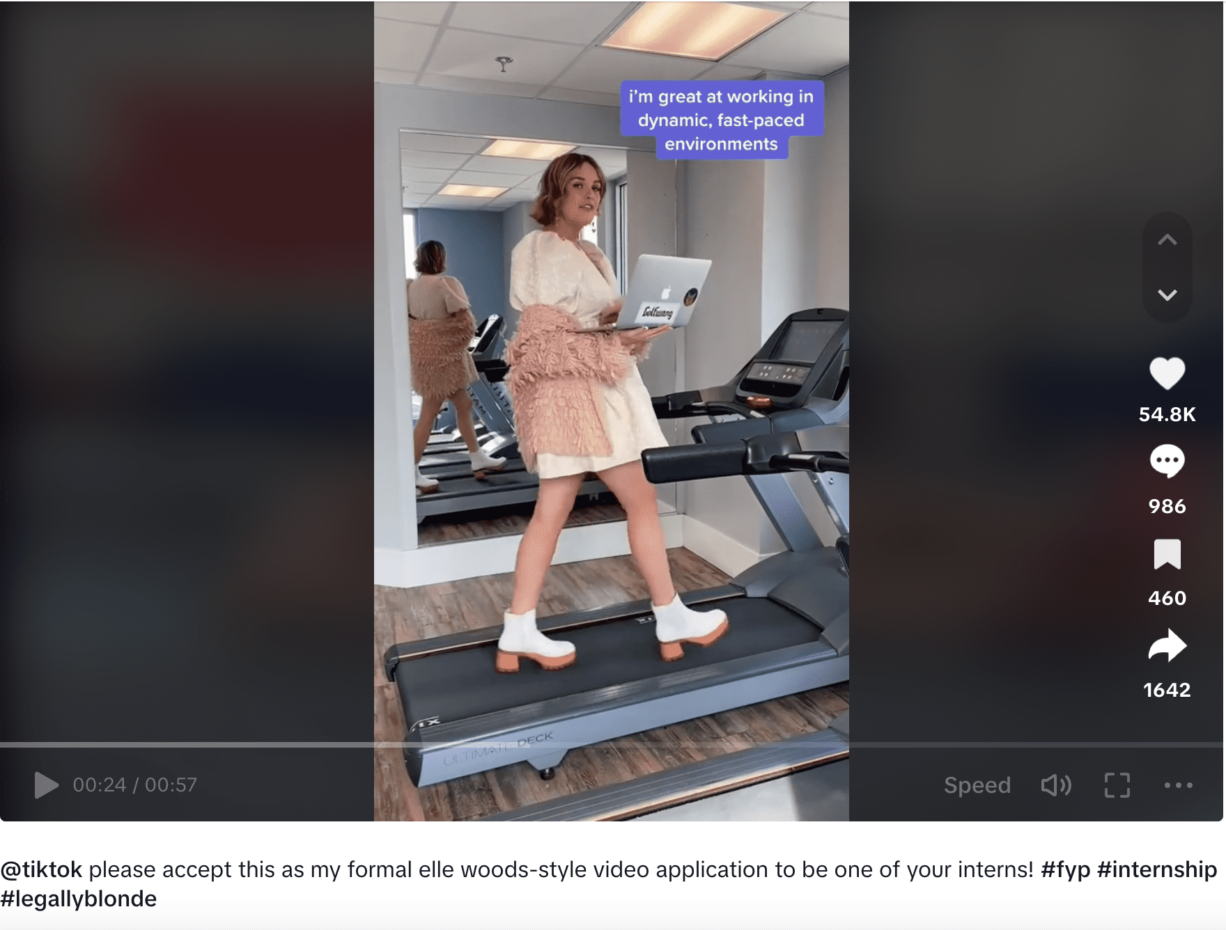 Kalli Roberts, een voormalig studente van Brigham Young University in Utah, is ook een kandidaat die dankzij TikTok een kans heeft gekregen. Nadat zij haar video-cv (geïnspireerd op Legally Blonde) had gepost, is het haar gelukt om een stage bij TikTok zelf in de wacht te slepen op hun afdeling global business. "Ik ben heel goed in het werken in een dynamische omgeving met een hoog tempo" zegt ze al lopend op een loopband.