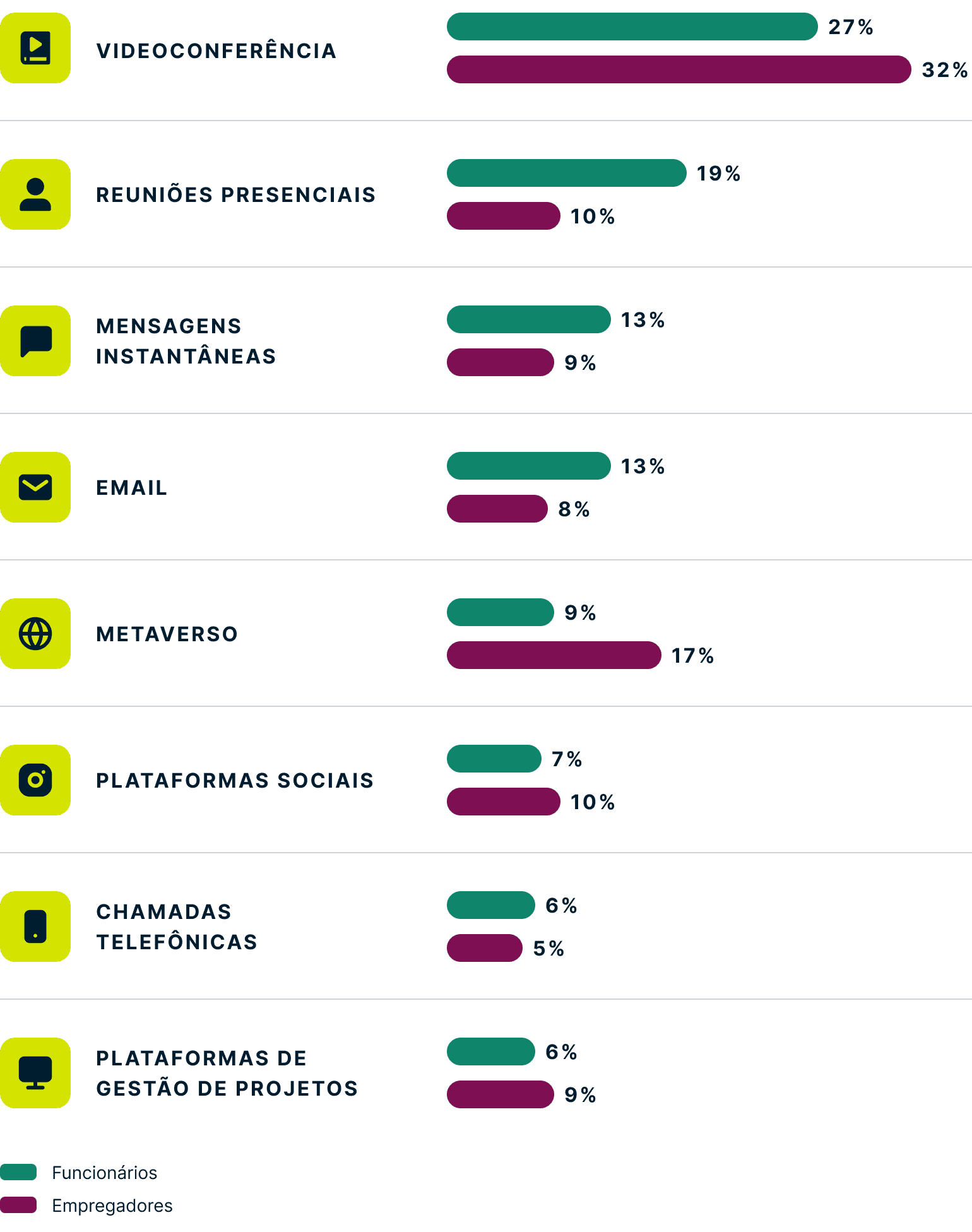 - Quem está interessado? 77% dos empregadores manifestaram interesse em ambientes de trabalho imersivos como o metaverso, em comparação com apenas 57% dos funcionários. (Ir para esta seção.)