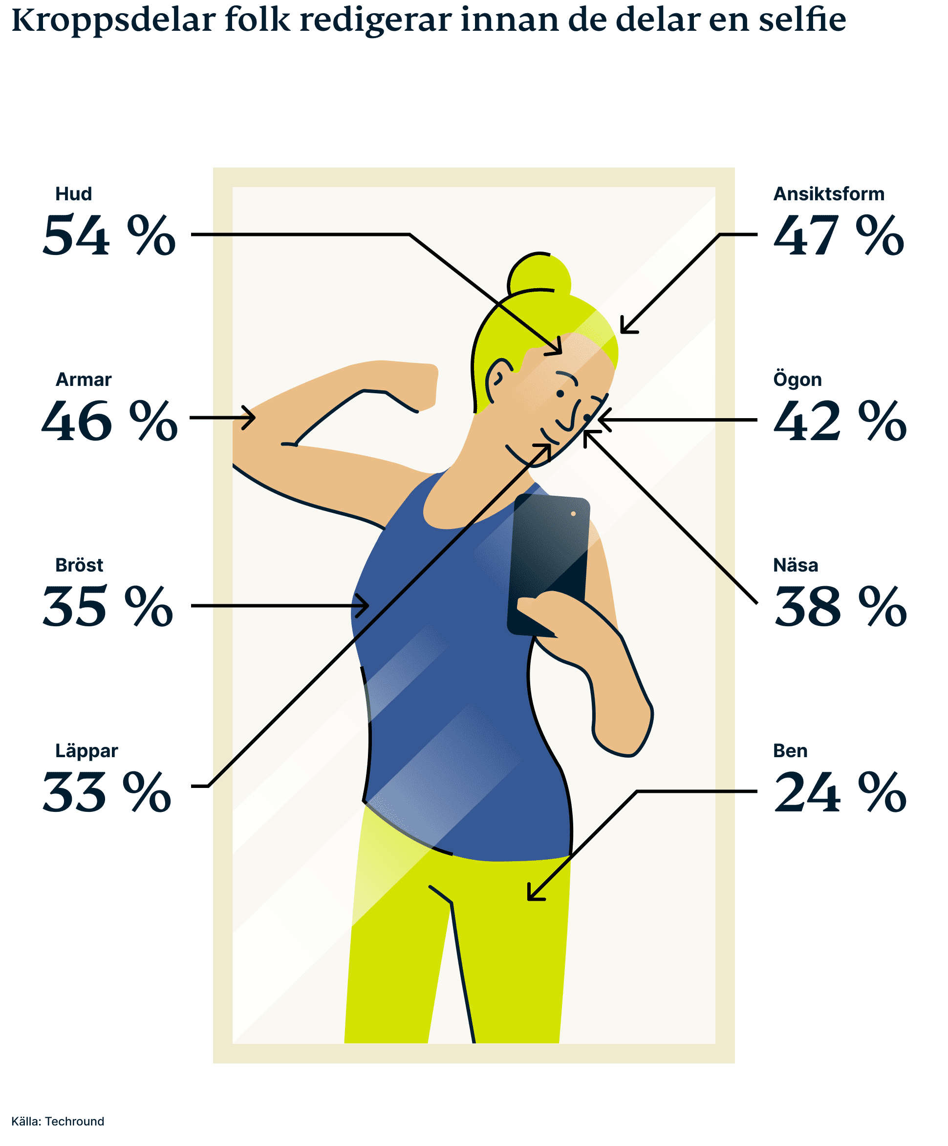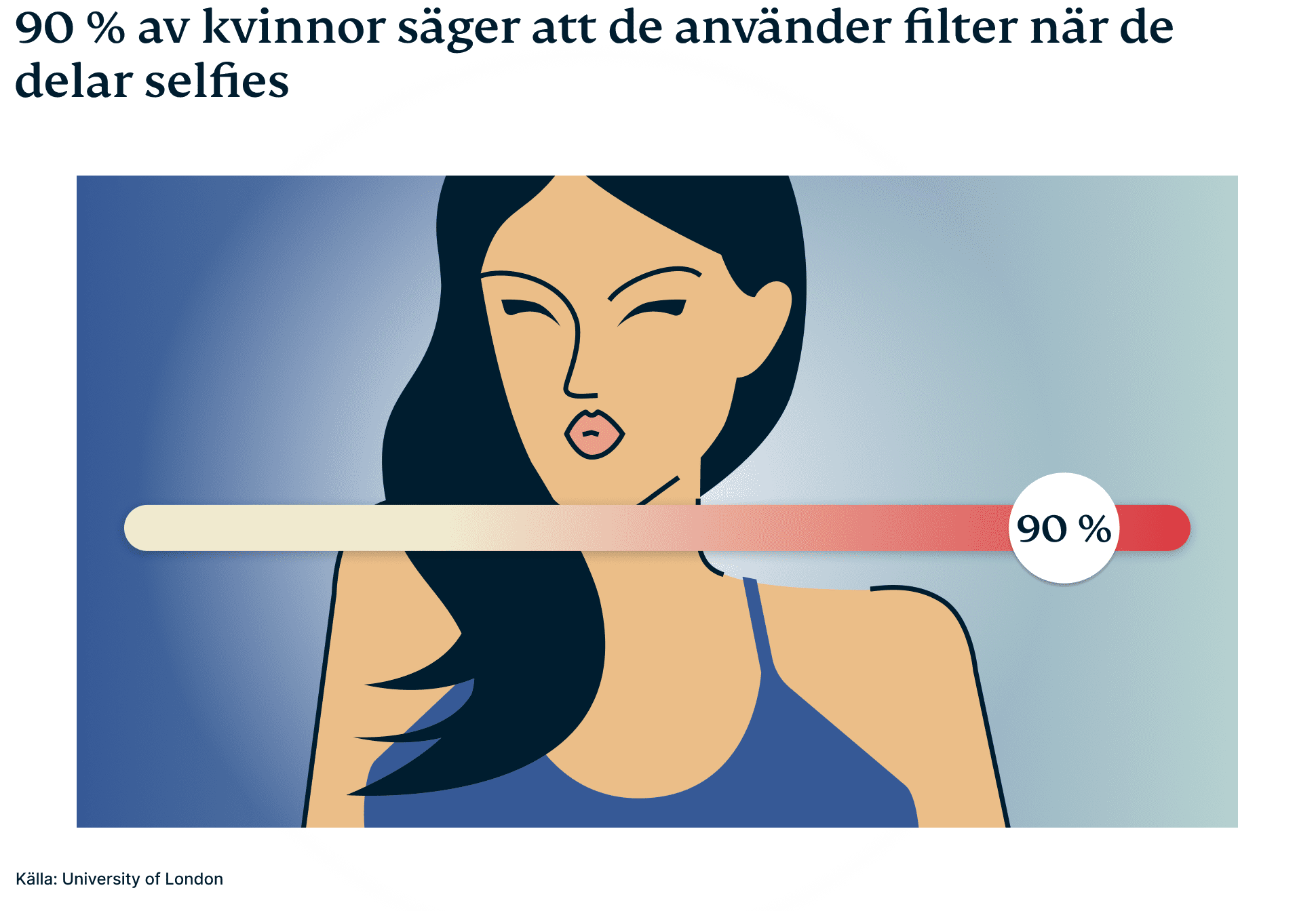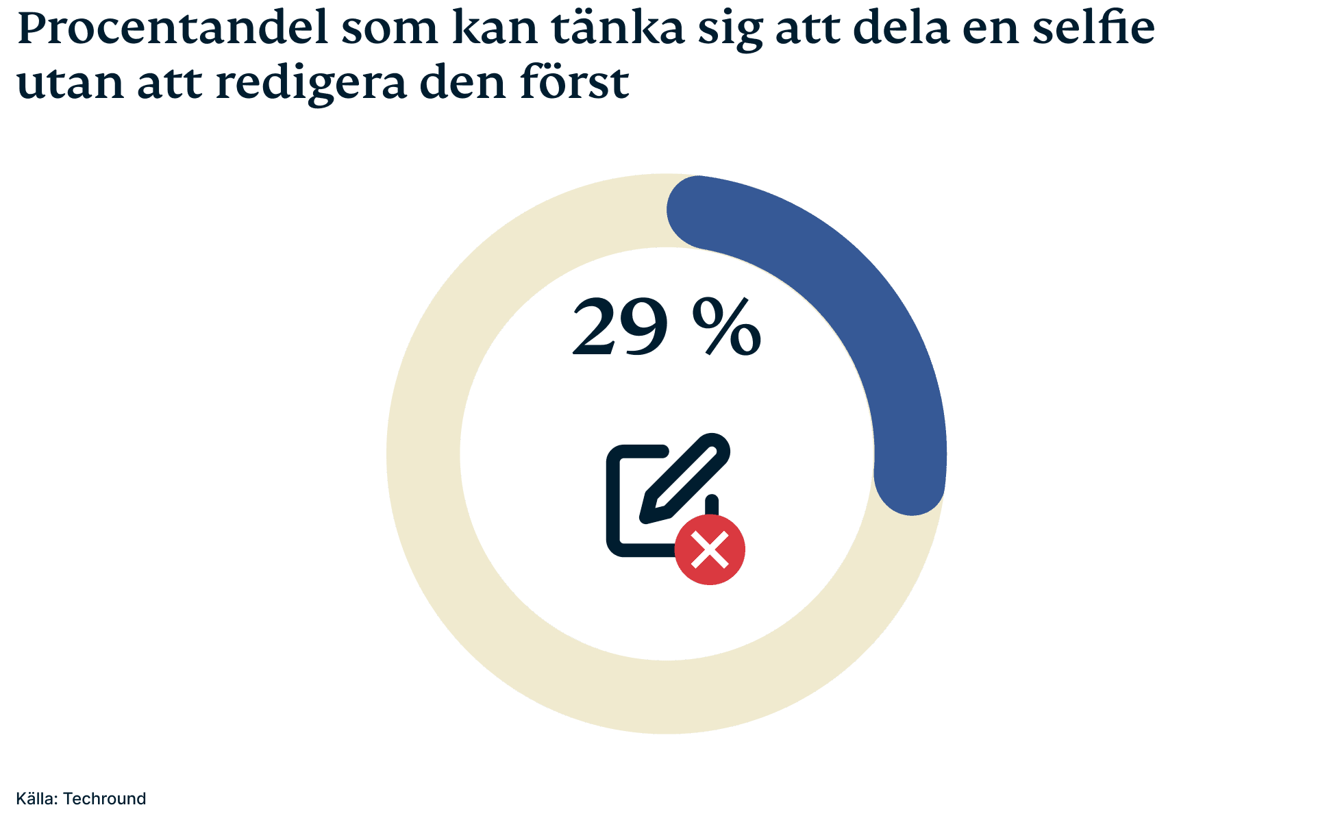 • Majoriteten av människor använder filter och redigeringsverktyg innan de lägger upp sina selfies online.