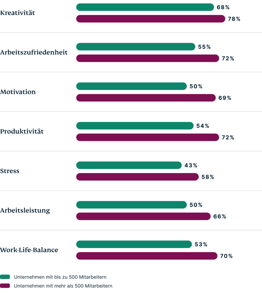 Dieser Unterschied in der Begeisterung zeigte sich auch bei der Befragung der Arbeitnehmer und Arbeitgeber nach den positiven Auswirkungen des Metaversums auf den Arbeitsplatz. Sowohl Arbeitnehmer als auch Arbeitgeber gaben am ehesten an, das Metaversum wirke sich positiv auf die Kreativität aus. Doch auch hier scheinen die Arbeitgeber mehr Begeisterung zu zeigen als die Arbeitnehmer, was die möglichen positiven Auswirkungen des Metaversums betrifft.