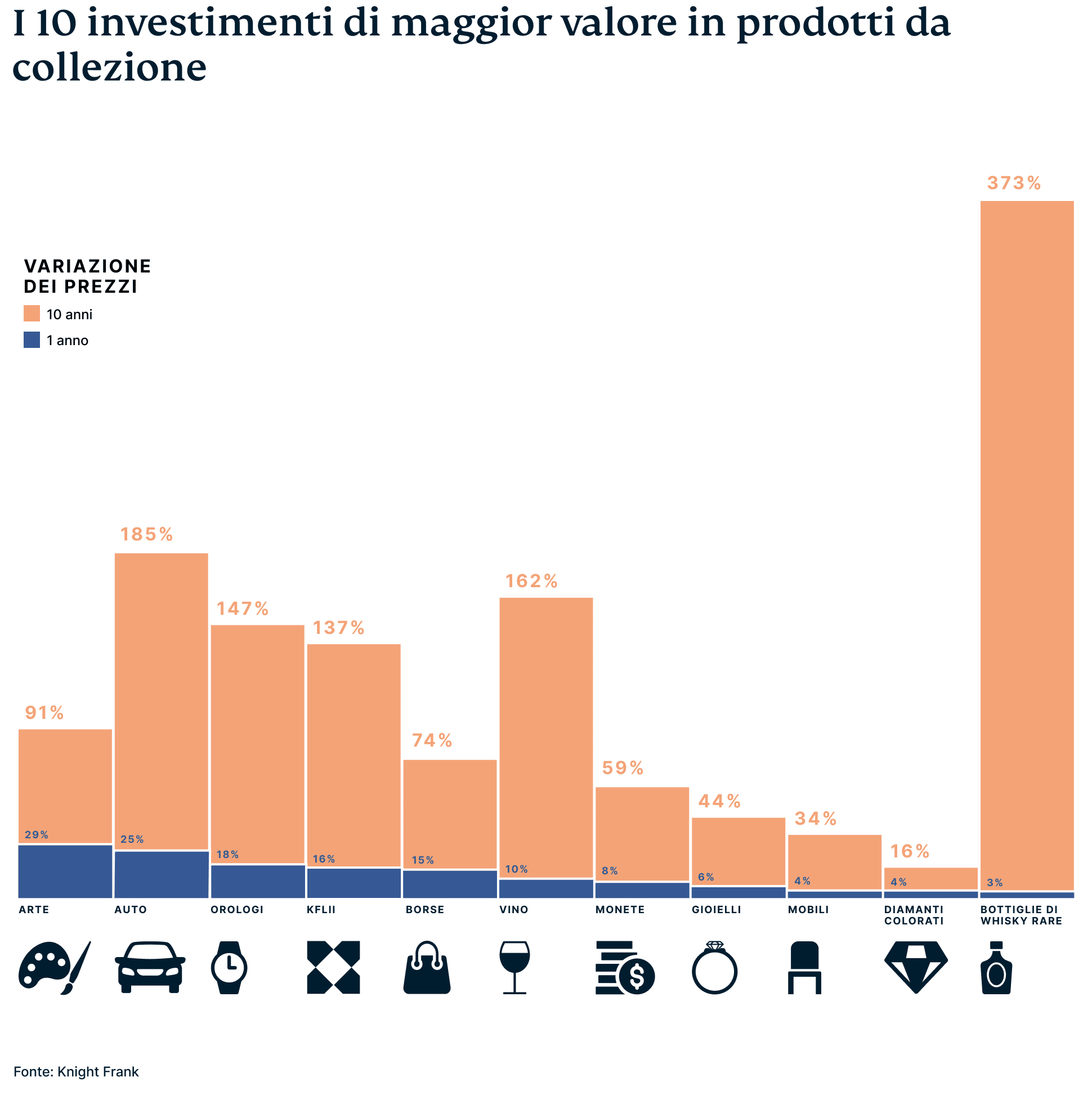 Quando si parla di classi di investimento in prodotti da collezione, secondo il Wealth Report 2022 di Knight Frank (KFLII), il whisky più raro è il leader indiscusso, con un tasso di crescita del 373% in 10 anni. È interessante osservare che nel determinare il valore del whisky entrano in gioco diversi fattori, tra cui l'età, la rarità e la qualità complessiva.