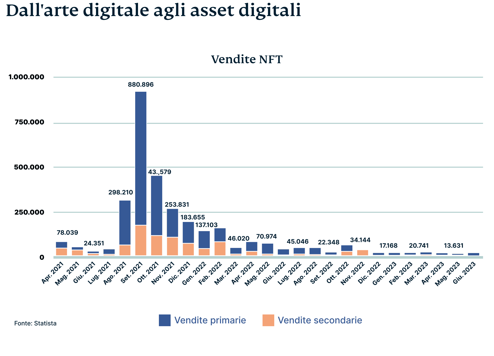 Diversi fattori hanno contribuito al declino del mercato degli NFT. Un fattore importante è stato il calo dell'entusiasmo iniziale per gli NFT, che ha portato molte persone ad adottare un atteggiamento più scettico nei confronti di questa tecnologia. Il seguente grafico illustra la traiettoria discendente delle vendite di NFT da aprile 2021 a giugno 2023.