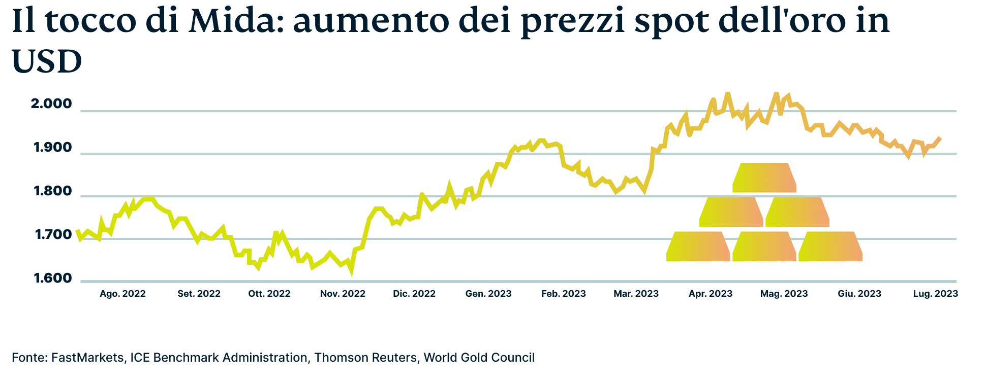 Come riportato da Barron's, una testata finanziaria, il prezzo dell'oro ha superato i 2.000 USD per oncia nell'aprile di quest'anno, segnando il secondo valore più alto della storia. La pubblicazione finanziaria ha sottolineato che fattori quali l'indebolimento del dollaro statunitense, il calo dei rendimenti obbligazionari e il potenziale rallentamento dell'economia hanno stimolato l'interesse per l'oro.