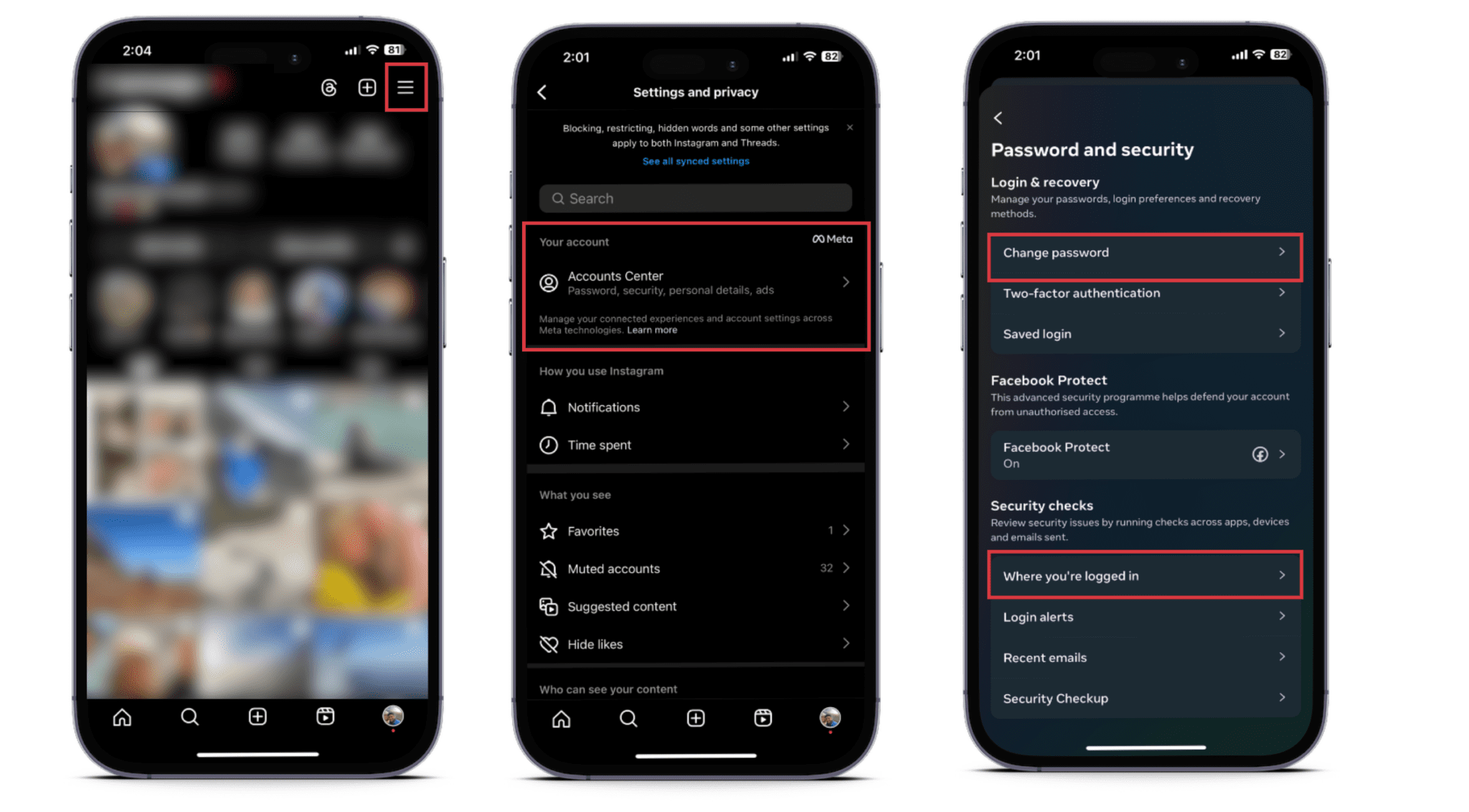 アカウントがハッキングされたと思われる場合、以下の対処法があります。 - すべてのデバイスをログアウトする:Instagramの設定にアクセスして、すべてのデバイスでアカウントからサインアウトしましょう。 - パスワードを変更する:他のアカウントでは使用していない、新しい強力なパスワードを使用しましょう。 - Instagramに乗っ取りを報告する:Instagramのヘルプセンターを開き報告を提出しましょう。