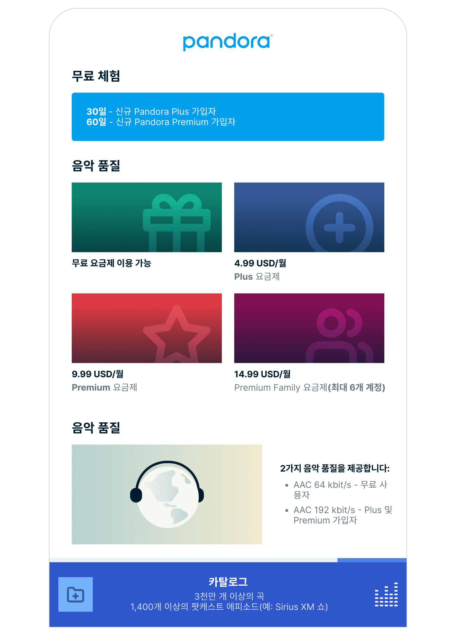 Pandora는 2000년대 초 미국에서 시작되었고 탄탄한 노래 추천 알고리즘으로 가장 많이 인정받고 있으며, 이 기능은 여전히 두드러집니다.