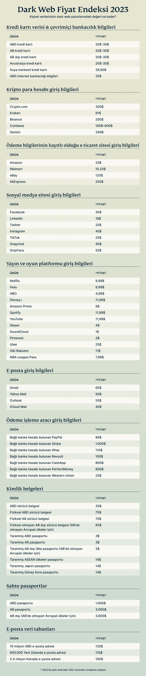 Konu dark web olduğunda, kişisel bilgiler, satılan verilerin türüne ve miktarına bağlı olarak farklı fiyatlardan satılabilir ve satın alınabilir. Buna birkaç dolardan satılan tek bir hesap giriş bilgisinden, binlerce dolar değerinde ve taranmış bir pasaport veya sahte dökümanı da içeren eksiksiz bir kimlik profiline kadar her şey dahildir. Dark web’de giderek büyüyen bu kişisel bilgi pazarı, kişilerin verilerini korumak amacıyla adımlar atmaları için çok önemli bir gerekçedir.
